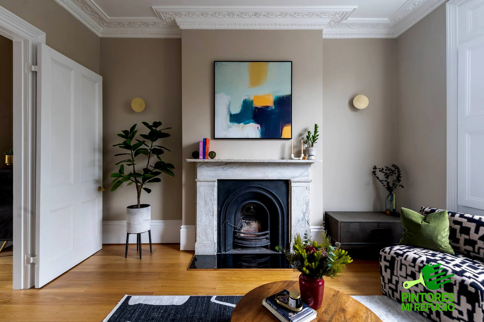 Tras nuestra intervención en la calle Serrano 45, 28006 Madrid (barrio de Salamanca), esta sala de estar luce renovada con una pintura suave y moderna, destacando la chimenea como punto focal. Añadimos detalles decorativos como plantas, arte contemporáneo y mobiliario elegante, creando un ambiente acogedor y sofisticado. ¡Déjanos transformar tu hogar con estilo!